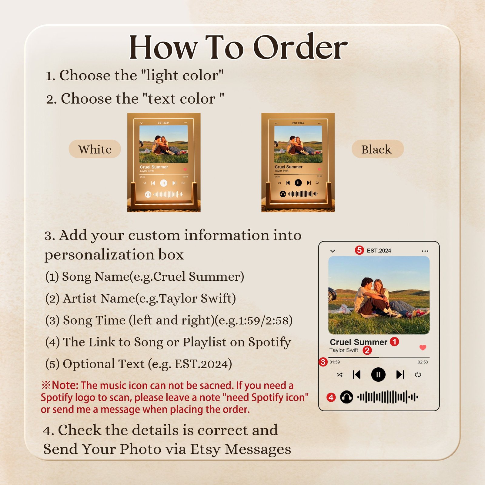 • 🎵 Personalized Song Details Choose your favorite track—add the song name and artist or even a scannable Spotify code. The music element makes it an extra special keepsake for couples, friends, or anyone tied together by a meaningful melody.