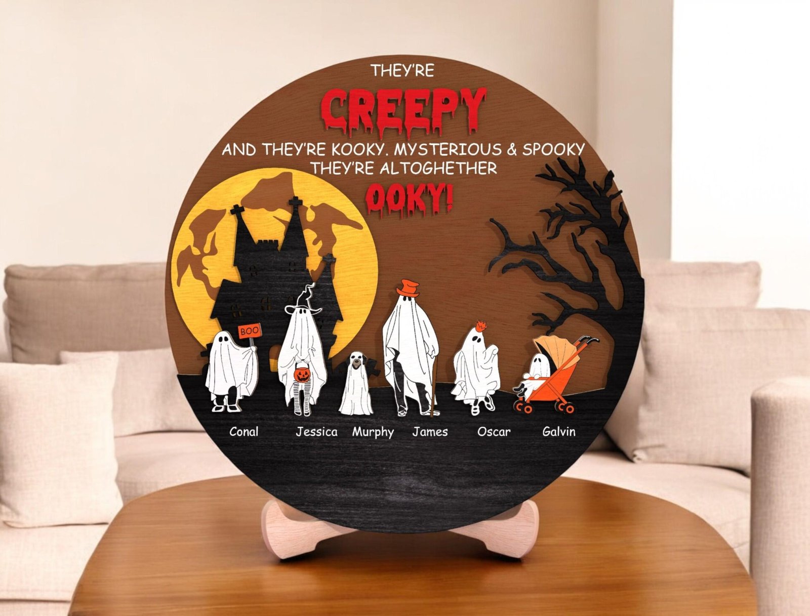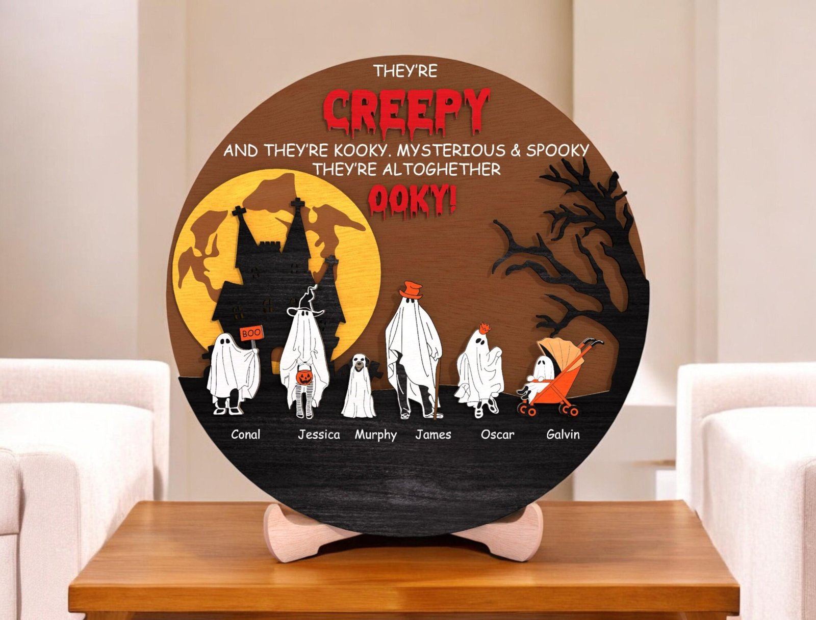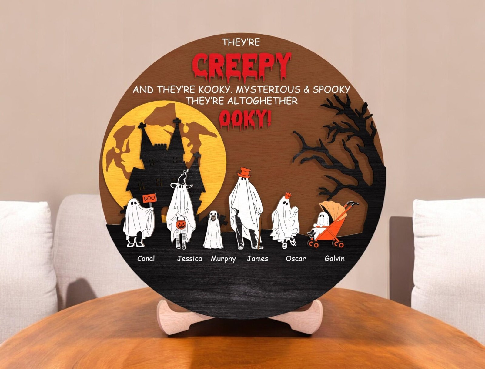 🕸️ Add some spooky charm to your Halloween decor with this personalized ghost family sign! This round wooden plaque features a haunted castle, full moon backdrop, spooky tree silhouette, and an adorable line of ghost family members — each labeled with a custom name. The bold quote “They’re creepy and they’re kooky, mysterious & spooky…” adds a fun touch inspired by classic Halloween vibes! Perfect as a seasonal decoration or a one-of-a-kind gift for Halloween-loving families, this piece brings warmth and whimsy to your home or entryway.